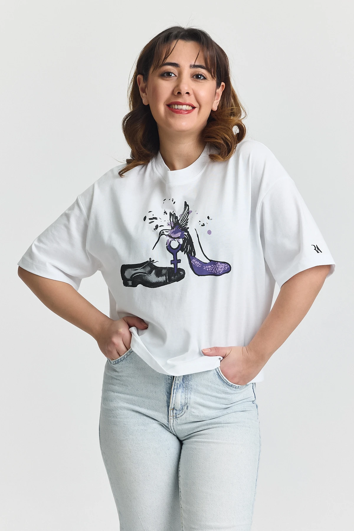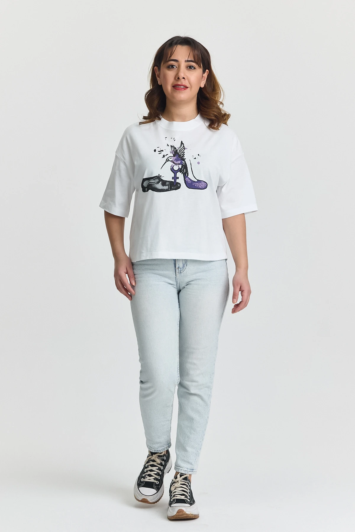 Beyaz baskılı kısa kollu oversize tişört, geniş kesimi ve pamuklu kumaşı ile gün boyu rahatlık sunar.